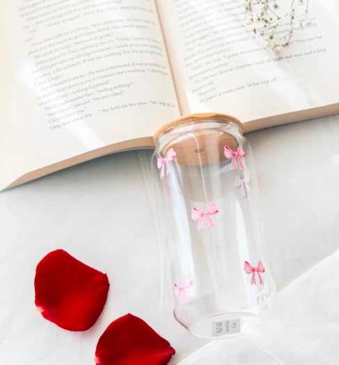 Generic - كوب زجاجي مطبوع مع ماصة، تصميم فيونكة بينك، سعة 500 مل، غطاء من الخيزران