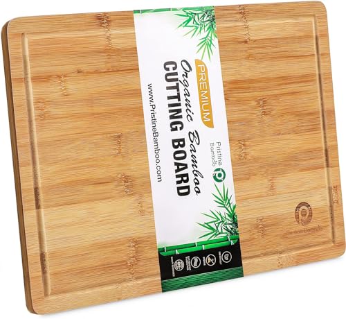 Pristine Bamboo - لوح تقطيع عضوي كبير جدا للمطبخ من بريستين بامبو - لوح تقطيع خشبي للمطبخ - لوح خشبي للجزار - لوح تقطيع خشبي مع أخدود للعصارة - لوح تقطيع للمطبخ للحوم والجبن والخضروات، 45.7 × 30.5 سم
