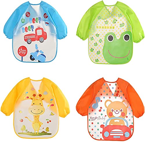 PRITZKER - مرايل اطفال باكمام طويلة مقاومة للماء من بريتزكر، مريلة اطفال بنمط لطيف، مرايل تغذية للجنسين، مريلة اطفال لطيفة للاطفال من عمر 6 اشهر الى 3 سنوات، 4 قطع