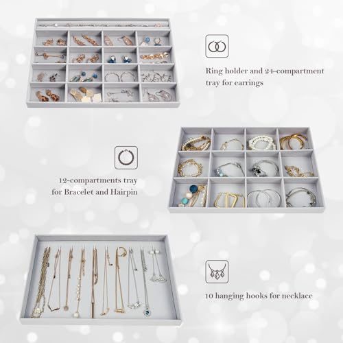 - ✅ مجموعة من 3 قطع: تتضمن هذه المجموعة 3 صواني لتخزين جميع أنواع المجوهرات تقريبًا: عبوة واحدة تحتوي على 24 مساحة تخزين وحامل خواتم لعرض الحلقان والخواتم؛ عبوة واحدة مع 12 صينية تخزين أكبر للأساور والساعة؛ عبوة واحدة بدون فواصل مع 10 خطافات تعليق للسلاسل