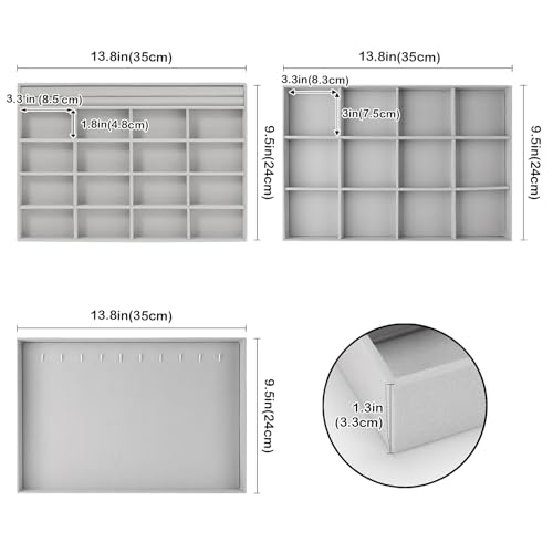 - ✅ متعددة الاستخدامات: يبلغ مقاس كل صينية 35.05 سم × 24.13 سم × 3.05 سم (طول × عرض × ارتفاع)، فواصل داخلية قابلة للإزالة تلبي احتياجات التخزين الشخصية الخاصة بك. مثالية لتخزين وعرض مجوهراتك في المنزل أو في المتجر