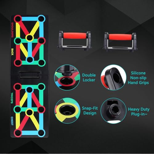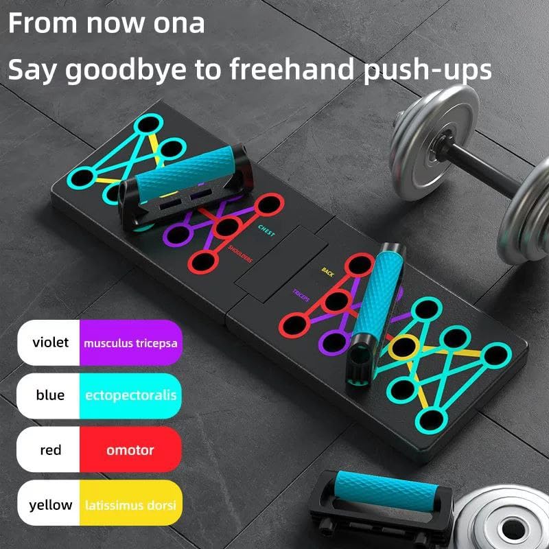 - لوحة تمارين push up board تضم أكثر من 20 تمرين مختلف لتقوية عضلات الصدر، الظهر، الترايسبس، البايسبس، والأكتاف.