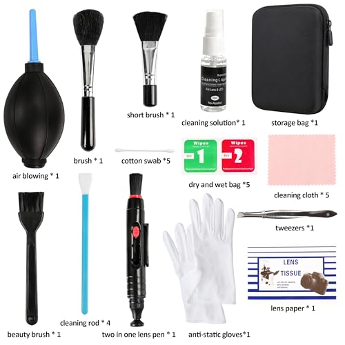 - مجموعة تنظيف الكاميرا من 14 قطعة: 1 × نفخ الهواء، قلم عدسة 2 في واحد، فرشاة × 1، فرشاة تجميل، 1 × فرشاة قصيرة، قطعة قماش للتنظيف × 5، ورق عدسة × 1، قضيب تنظيف × 4، محلول تنظيف، 1 × كيس جاف ورطب، ملاقط × 1، حقيبة تخزين × 1، مسحة قطنية × 5، قفازات مضادة للكهرباء الساكنة