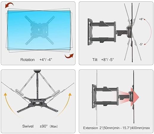 - حركة كاملة ومرنة: تصميم قابل للإمالة والدوران والتمديد يتيح لك ضبط زاوية المشاهدة المثالية من أي مكان في الغرفة
