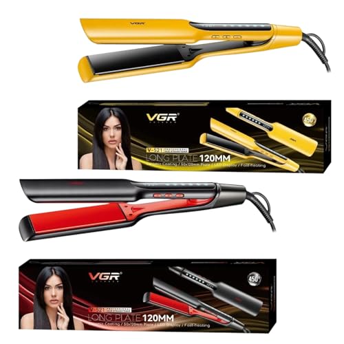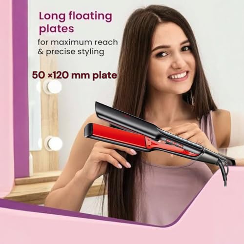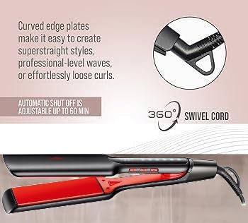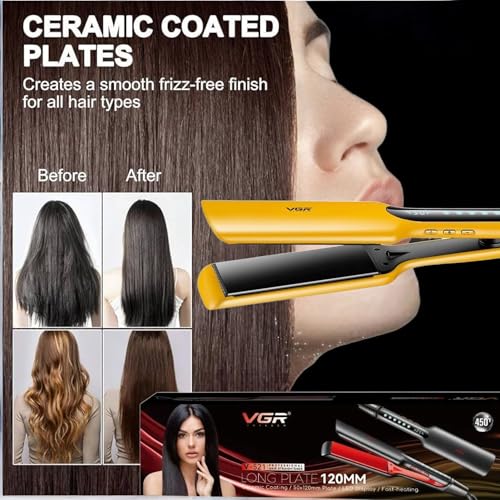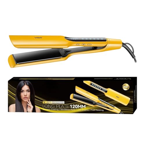 - ألواح طويلة للغاية: تتميز بألواح مطلية بالسيراميك بدرجة احترافية 120 ملم توفر تغطية أوسع لتصفيف أسرع، مما يسمح لك بفرد أجزاء أكبر من الشعر في تمريرة واحدة مع ضمان توزيع متساوٍ للحرارة للحصول على نتائج ناعمة وأنيقة