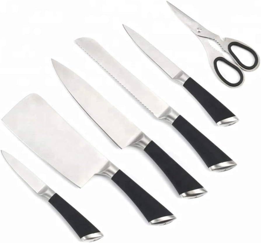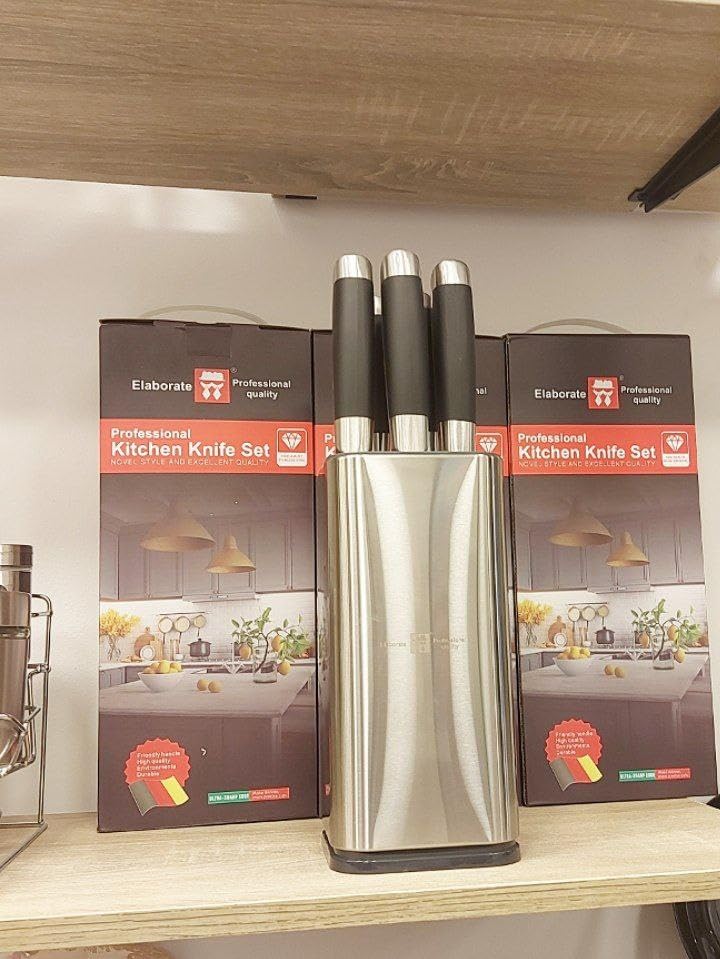 - مجموعة كاملة: مجموعة سكاكين المطبخ الاحترافية المكونة من 6 قطع تتضمن 4 سكاكين ومقص مطبخ وساطور، جميعها موجودة في حامل أنيق من الستانلس ستيل