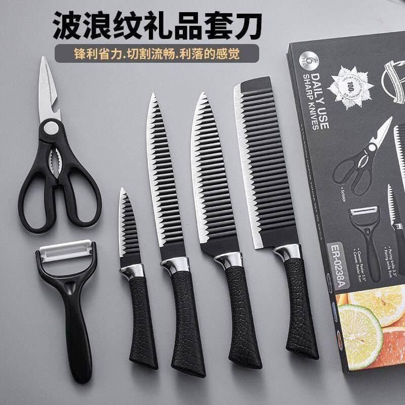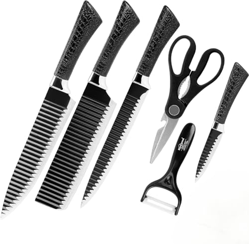 - مجموعة سكاكين مطبخ كاملة من 6 قطع - تتضمن مجموعة سكاكين المطبخ متعددة الاستخدامات هذه ثلاثة سكاكين متعددة الأغراض وساطور متين ومقشرة خضروات ومقص مطبخ لدعم مجموعة واسعة من مهام إعداد الطعام. سواء كنت تقوم بتقطيع الخضروات أو تقطيع اللحم أو تحضير المكونات للطهي اليومي، فإن المجموعة توفر أدوات أساسية مصممة لتبسيط إعداد الوجبات.