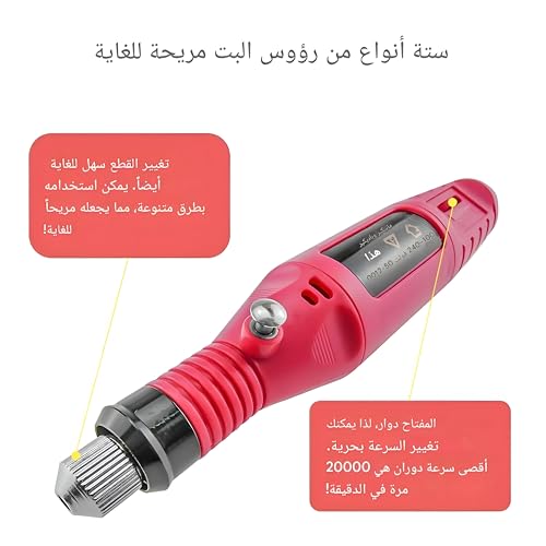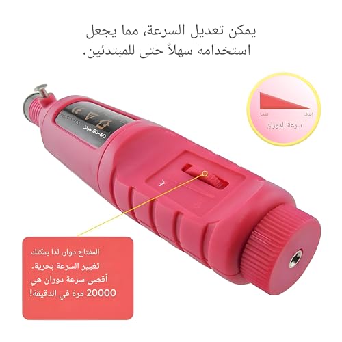- تحكم متغير في السرعة يتراوح من 3000 إلى 20000 دورة في الدقيقة، مناسب لتشكيل الجل أو الاكريليك أو الزجاج أو الأظافر الطبيعية أو الصناعية بدقة.