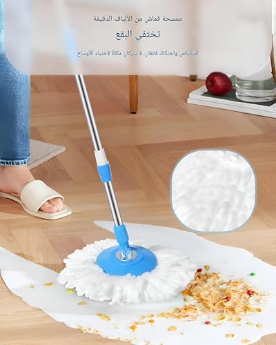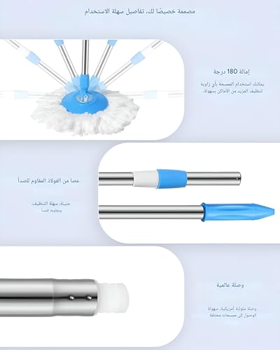 - رأس الممسحة الدوارة بزاوية تصل إلى 180 درجة يسمح بالتنظيف الدقيق والفعال في الزوايا الضيقة وتحت الأثاث، مما يزيد من كفاءة التنظيف ويقلل من الحاجة للتحريك المتكرر للأثاث أو الأدوات الأخرى.