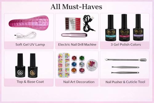 - مجموعة كاملة من الجل الناعم للمبتدئين، كل ما تحتاجينه للحصول على مانيكير جل كامل في المنزل في حزمة واحدة. تتضمن مصباح الأشعة فوق البنفسجية، ومثاقب أظافر كهربائي، و3 ألوان طلاء جل، وطبقة أساسية، وطبقة علوية، وديكورات لفن الأظافر، والأدوات الأساسية.