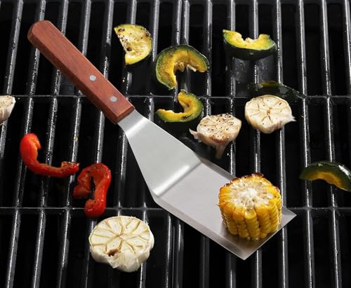 - الأبعاد: شفرة عريضة من فولاذ مقاوم للصدأ مع حافة بزاوية مثالية لسهولة الانزلاق تحت الطعام، مع مقبض خشبي قوي