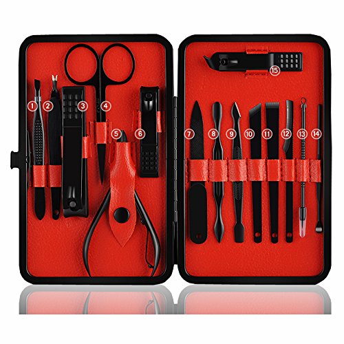 Nutrascience - مجموعة قصافة اظافر احترافية من الستانلس ستيل للسفر والعناية باظافر اليدين والباديكير مكونة من 15 قطعة مع حافظة فاخرة (اسود واحمر)