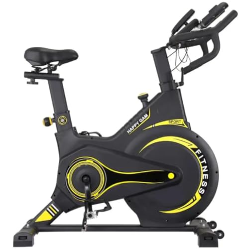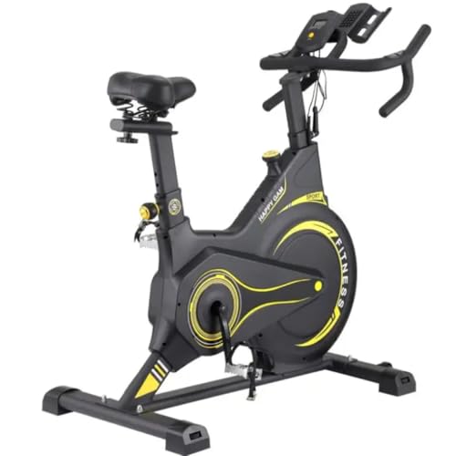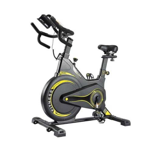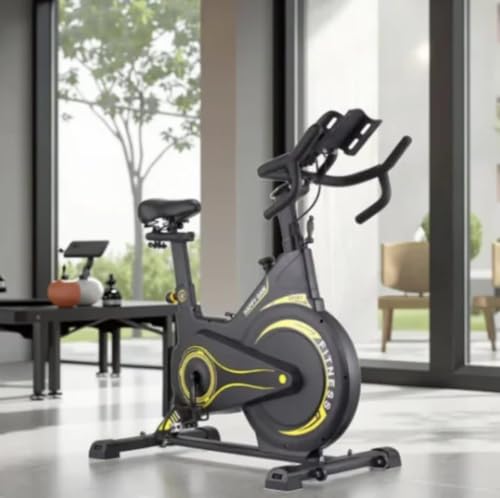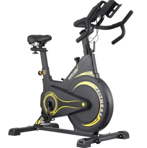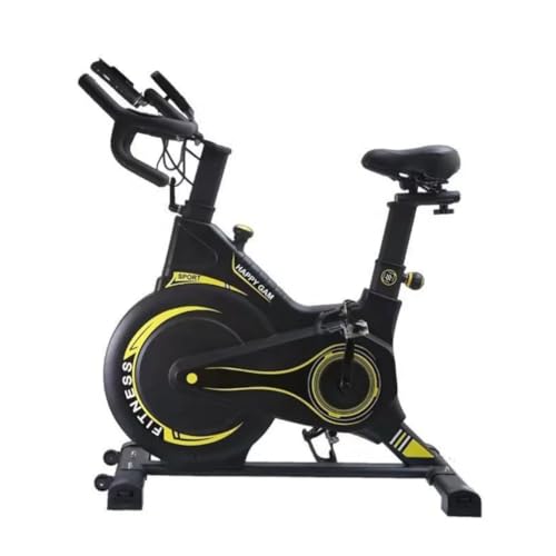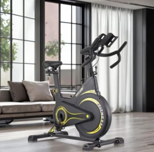 - التصميم المتقدم: دراجة تمارين ثابتة احترافية بتصميم عصري باللونين الأسود والأصفر، مثالية للتمارين المنزلية