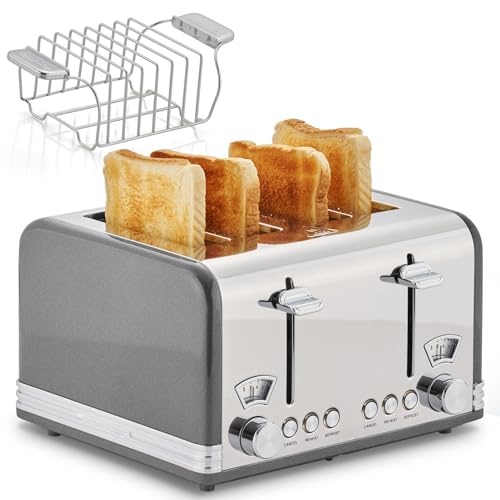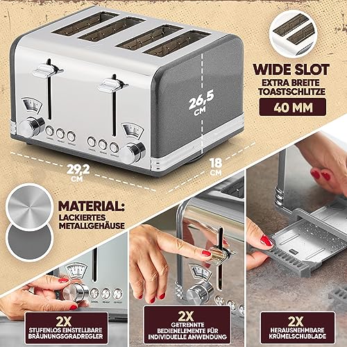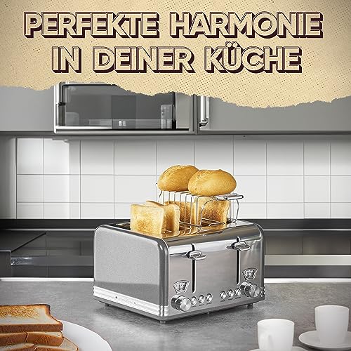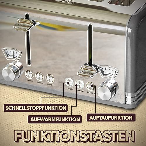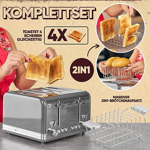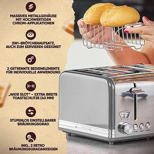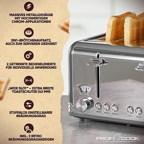 Profi Cook - بروفي كوك محمصة خبز من 4 شرائح، مظهر عتيق، هيكل من الستانلس ستيل، ملحق كعكة، درجة تحميص قابلة للتعديل بالكامل، وظيفة توسيط، درج فتات الفتات، ستانلس ستيل/رصاصي