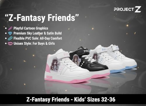 Project Z - سنيكرز للأطفال موديل Z-Fantasy Friends من Project Z – كوتشي كاجوال برقبة للجنسين مطعم بجلد السكاي والستان – نعل PVC مرن ورسومات كرتونية جذابة – مقاس (32-36) مريح جداً للمدرسة والخروجات.
