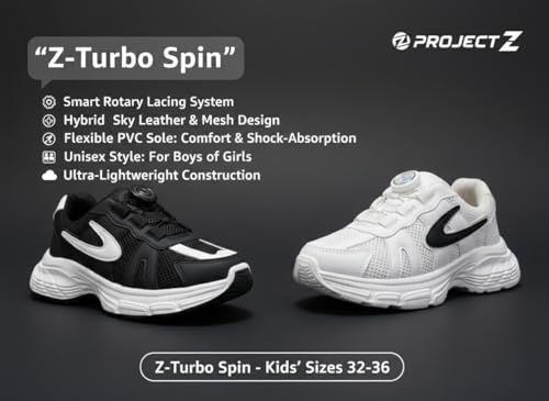 Project Z - سنيكرز للأطفال موديل Z-Turbo Spin من Project Z – كوتشي للجنسين بنظام ربط دوار سريع – مزيج من جلد السكاي والستان مع نعل PVC مرن – مقاس (32-36) مريح جداً للمدرسة والرياضة.