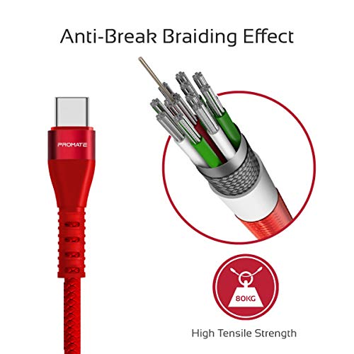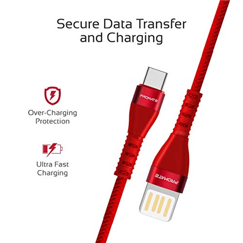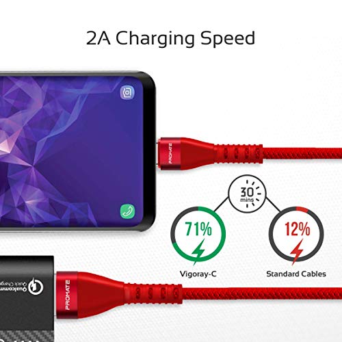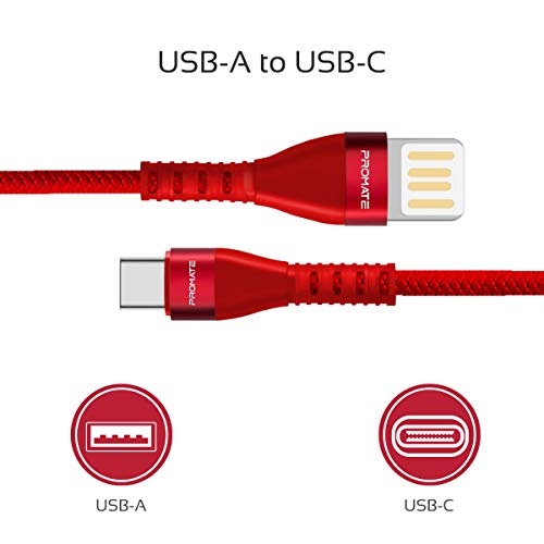 Promate - كابل USB-A الى USB-C عالي الجودة خالي من التشابك قابل للانعكاس للشحن ونقل البيانات بسرعة فائقة لجميع الاجهزة المدعومة بمنفذ وVigoray-C بروميت - 2 امبير - احمر محول الشحن حاسوب شخصي لوحي محمول