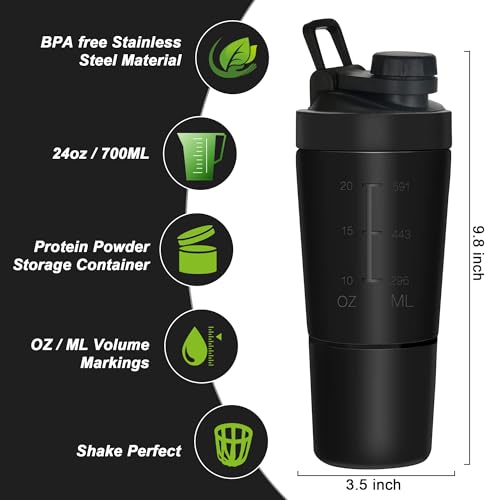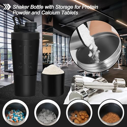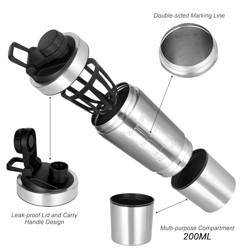 KOWVOWZ - زجاجة شيكر للبروتين من الفولاذ المقاوم للصدأ، زجاجة شيكر للبروتين مانعة للتسرب مع جيب للمسحوق، للياقة البدنية والمشي لمسافات طويلة وركوب الدراجات (600 + 200 مل)
