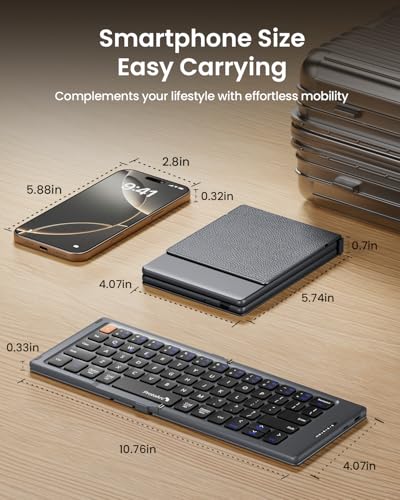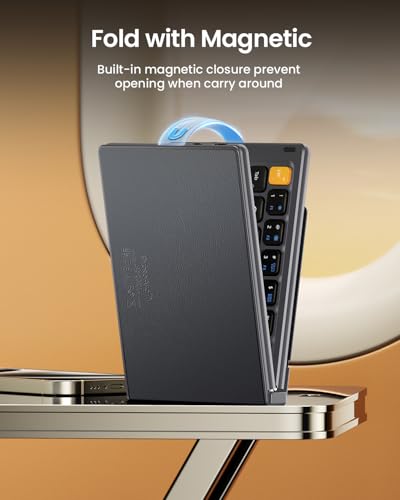 - 【كيبورد صغيرة قابلة للطي】 تم تصميم لوحة المفاتيح القابلة للطي بحجم راحة اليد بسعة 5.65 اونصة فقط بطين وصغيرة بما يكفي لتوفير مساحة المكتب أو أخذها أثناء التنقل. أغطية بسطح من جلد البولي يوريثين، ملمس وحماية جيدة، رفيق مثالي للمسافرين من رجال الأعمال. أقصى قدر من الراحة لك مع الحد الأدنى من الوزن والحجم