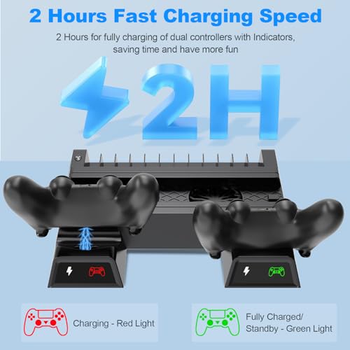 - 【قاعدة شحن آمنة وموثوقة】- رقائق ذكية مدمجة ومكونات عالية الجودة تمنع أجهزة التحكم المزدوجة وأجهزتك من الحماية من التيار الزائد أو الجهد الزائد أو الماس الكهربائى. لا تفرط في شحن وحدة التحكم PS4 حتى إذا شحنتها طوال الليل. 4 وسادات مطاطية مضادة للانزلاق تحافظ على قاعدة الشاحن في مكانها، مما يحمي قاعدة شحن PS4 من الحركة والسقوط.