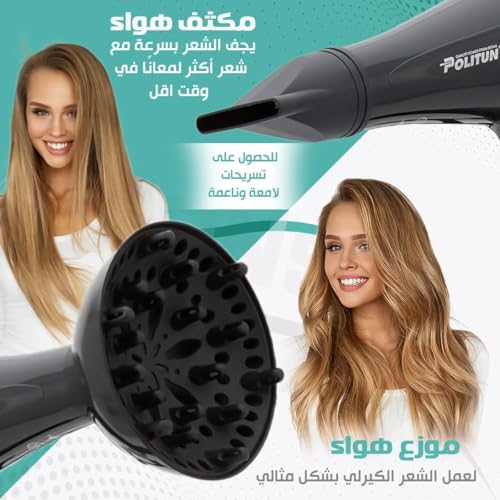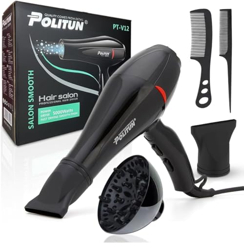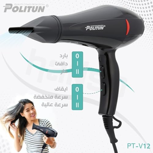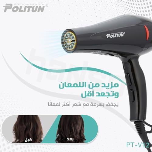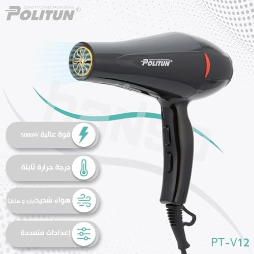 Generic - مجفف شعر بتصميم بصوت هادئ وإعدادات قابلة للتخصيص وحماية من الحرارة الزائدة لتجفيف بسرعة بوليتون 5000 وات موديل PT-V12 5000.0 واط أسود