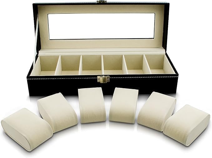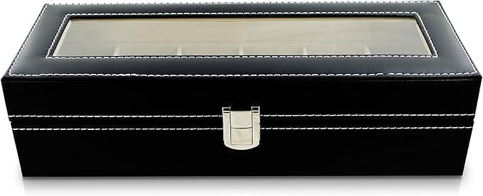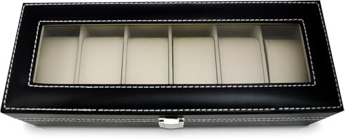 Generic - صندوق ساعة جلد البولي يوريثين للرجال والنساء حافظة عرض الساعة مع اغطية زجاجية ووسادة قابلة للازالة تخزين لعرض الساعات كهدية لعيد الحب وعيد الميلاد أسود (6 فتحه)