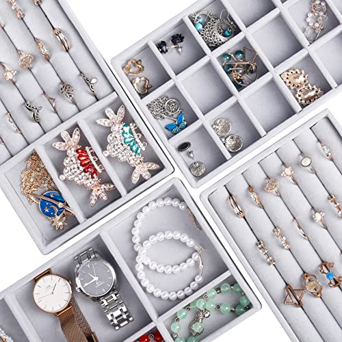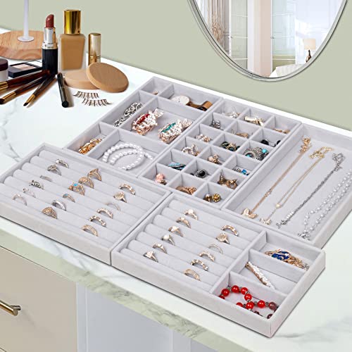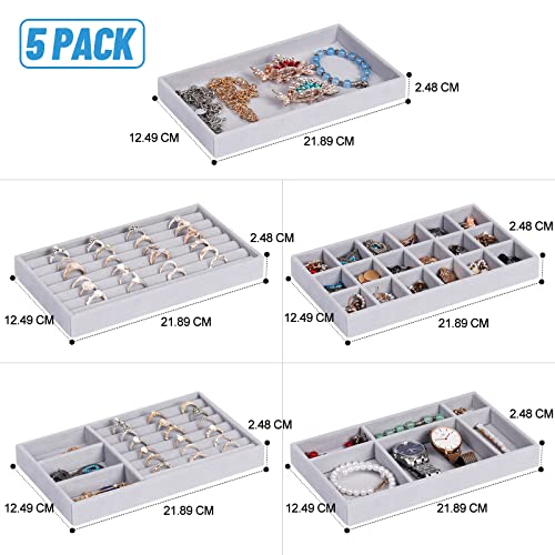 punemi - منظم مجوهرات، 5 عبوات من منظم المجوهرات القطيفة القابل للتخزين للدرج، صواني عرض وتخزين المجوهرات لعرض الدولاب، حامل منظم للحلقان والأساور والسلاسل والخواتم، هدية للنساء، مخمل، رمادي، من بونيمي