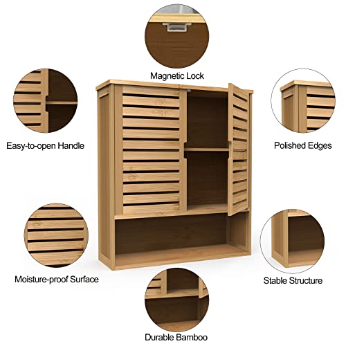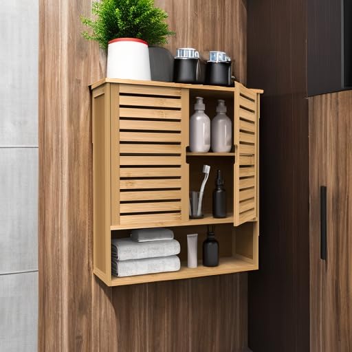 Purbambo - دولاب حمام بامبو يعلق على الحائط، منظم لتخزين الادوية ببابين ورفوف 3 طبقات قابل للتعديل للحمام والمطبخ وغرفة المعيشة من بوربامبو، خيزران، خزانة حائط، أصفر
