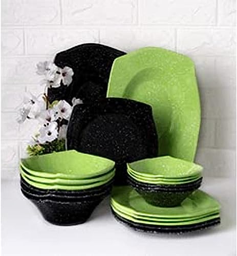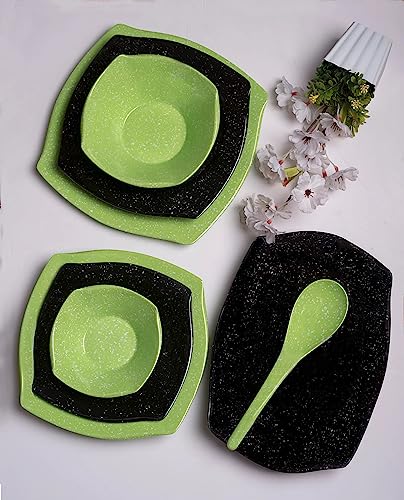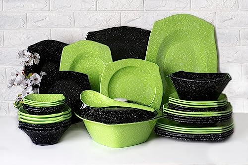 PURE - طقم أطباق مربعة من الميلامين بتصميم منقط مع اطباق جرانيت مربعة للمنزل والمطعم من 38 قطعة من بيور - لون أسود أخضر