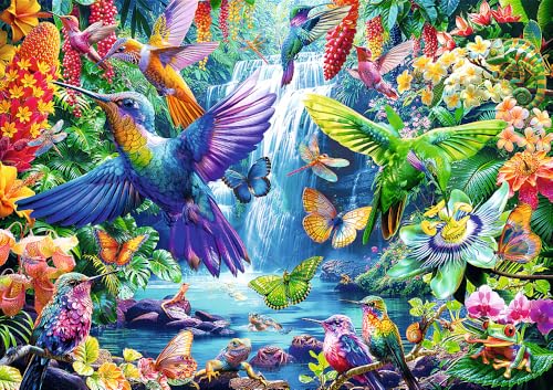 - مع البازل المكون من 1000 قطعة المثالي لمحبي الألغاز، يمكنك تشكيل صورة بالشكل المطلوب بقياس 6.83 × 4.80 سم، تظهر الطيور الطنانة الملونة المحاطة بالنباتات الاستوائية والشلال.