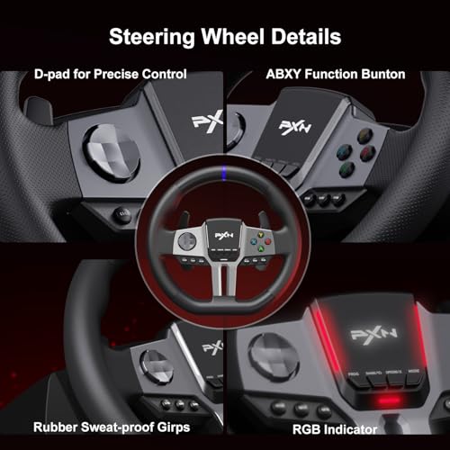 PXN - طارة دركسيون للكمبيوتر من في 9 الجيل الثاني لجهاز بلاي ستيشن 4 مع أذرع نقل الحركة ودواسة تأثير وناقل حركة 6+R وتأتي مع تطبيق مخصص وتتوافق مع Xbox Series X/S، Xbox One، كمبيوتر PS4 وPS3 من بي اكس ان