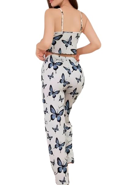 Generic - بيجامة نسائية بدون اكمام بطبعة فراشة، خامة مضلعة، نمط صيفي كاجوال، حتى 65 كجم - بيجاما نسائية بدون اكمام بطباعة فراشات، خامة مضلعة، تصميم حمالات رفيعة، نمط صيفي كاجوال