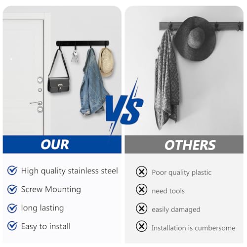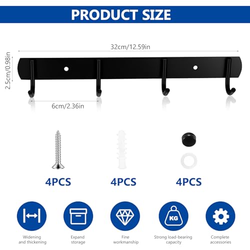 - 4 خطافات: يحتوي حامل السترات على 4 خطافات مثالية لتعليق المفاتيح والقبعات والمظلات والمحافظ والأوشحة وحقائب اليد والسترات والمناشف وأدوات المطبخ وغيرها من الأشياء على جدران منطقة المدخل والرواق والمطبخ وغرفة المعيشة، مما يوفر مساحة على الحائط.