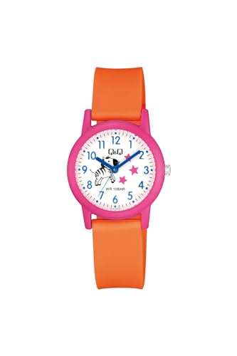 Q&Q - ساعة اطفال V23A-009VY، رقمي تناظري، بمينا برتقال، بسوار فضة