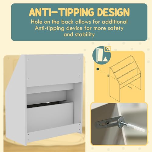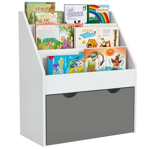 Qaba - رفت كتب مصمم كمنظم تخزين ألعاب مع 3 أرفف عرض ودرج للحضانة وغرفة النوم وغرفة المعيشة والفصل الدراسي للأطفال من قبا، لون رمادي