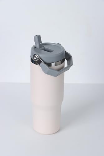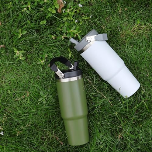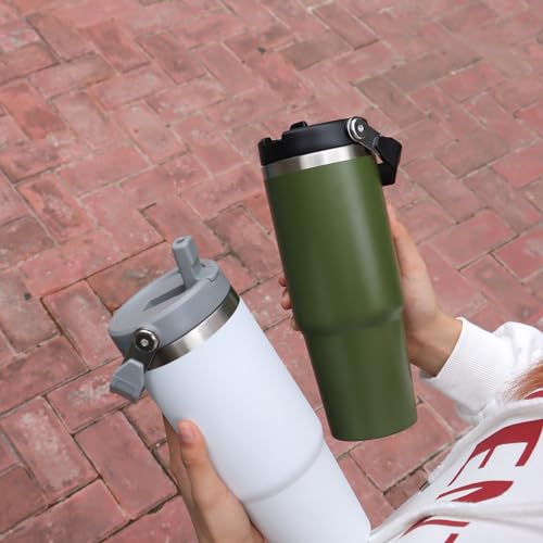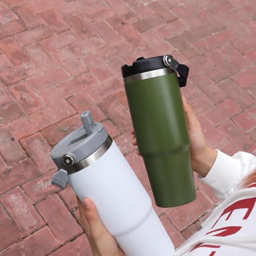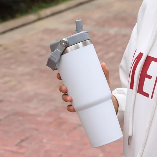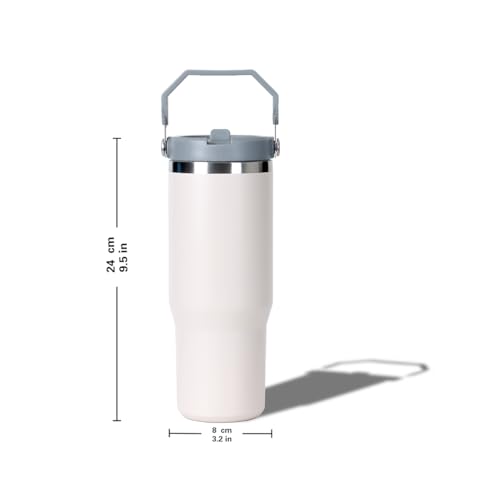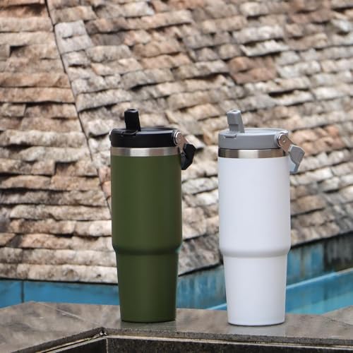 Qair - كوب قهوة معزول من فولاذ مقاوم للصدأ بسعة 852 مل مع مقبض وغطاء بماصة قلاب للسفر والرياضة من كير، أبيض