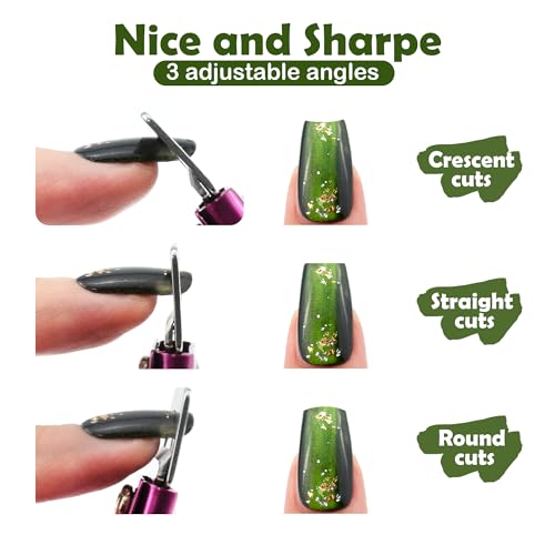 - أداة متعددة الاستخدامات لفن الأظافر: القص بزوايا مختلفة يخلق أشكالًا مختلفة لأطراف الأظافر، بما في ذلك القطع المستقيمة أو القطع الدائرية أو القطع الهلالية.