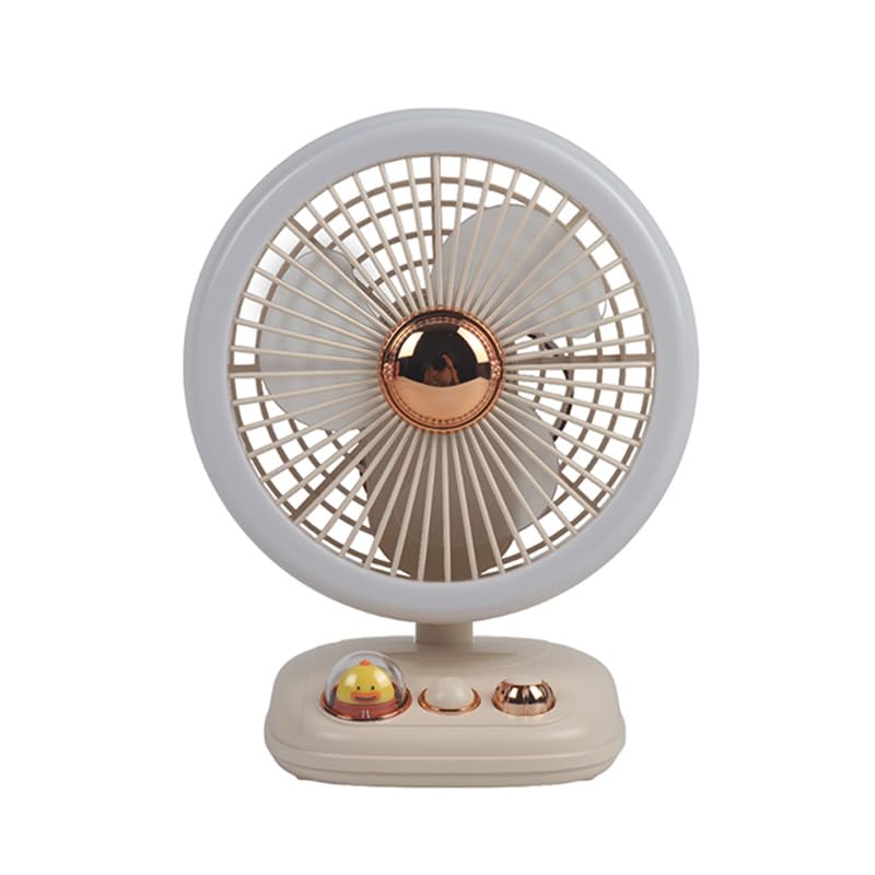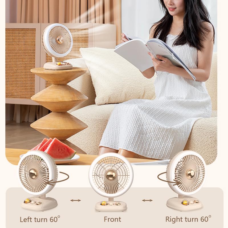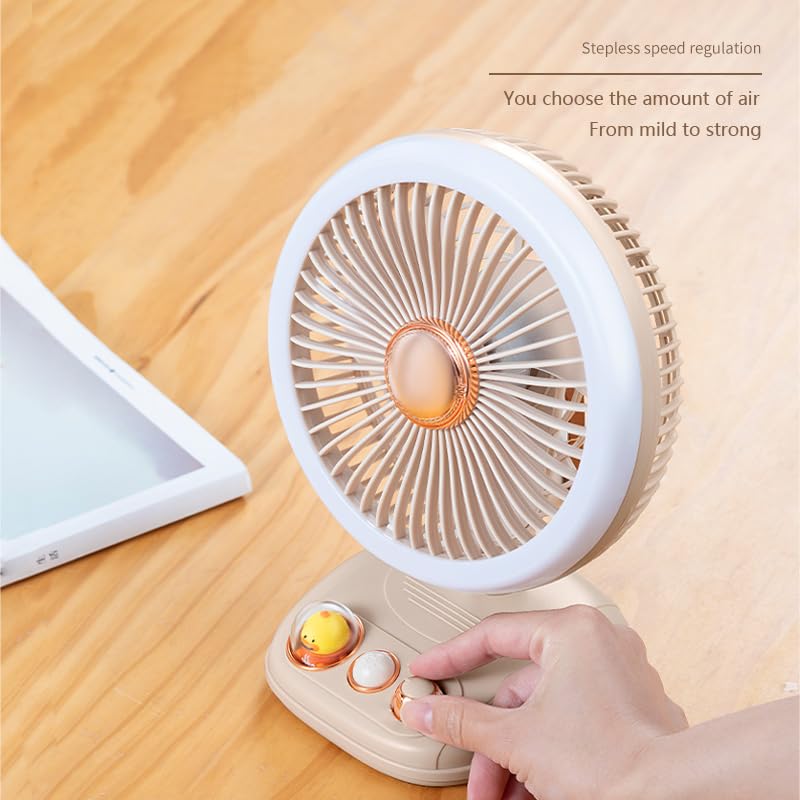 QAREQU - مروحة مكتب بإضاءة ليد من كاريكو، تدفق هواء هادئ متغير السرعة، تعمل ببطارية قابلة لإعادة الشحن (بيج)