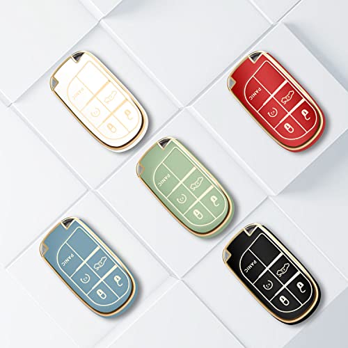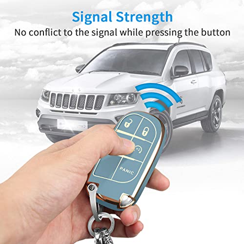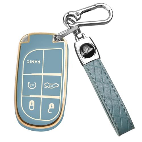 QBUC - غطاء حماية لمفتاح سيارة جيب مع سلسلة مفاتيح جلدية من البولي يوريثين الحراري متوافق مع مفتاح جراند شيروكي رينيجيد الذكي