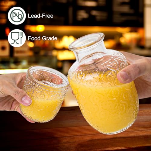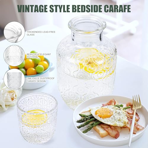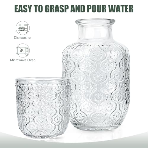 - 【زجاج سميك كلاسيكي】 طقم دورق زجاجي بجانب السرير مصنوع من زجاج سميك خالٍ من الرصاص وغير سام وعالي الجودة وآمن غذائيًا مع تصميم زهور عتيق سهل الإمساك وآمن للغسل في غسالة الأطباق