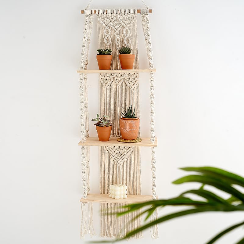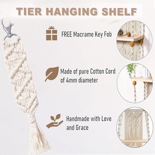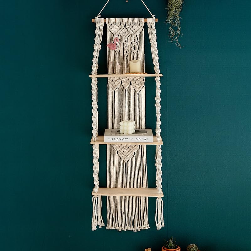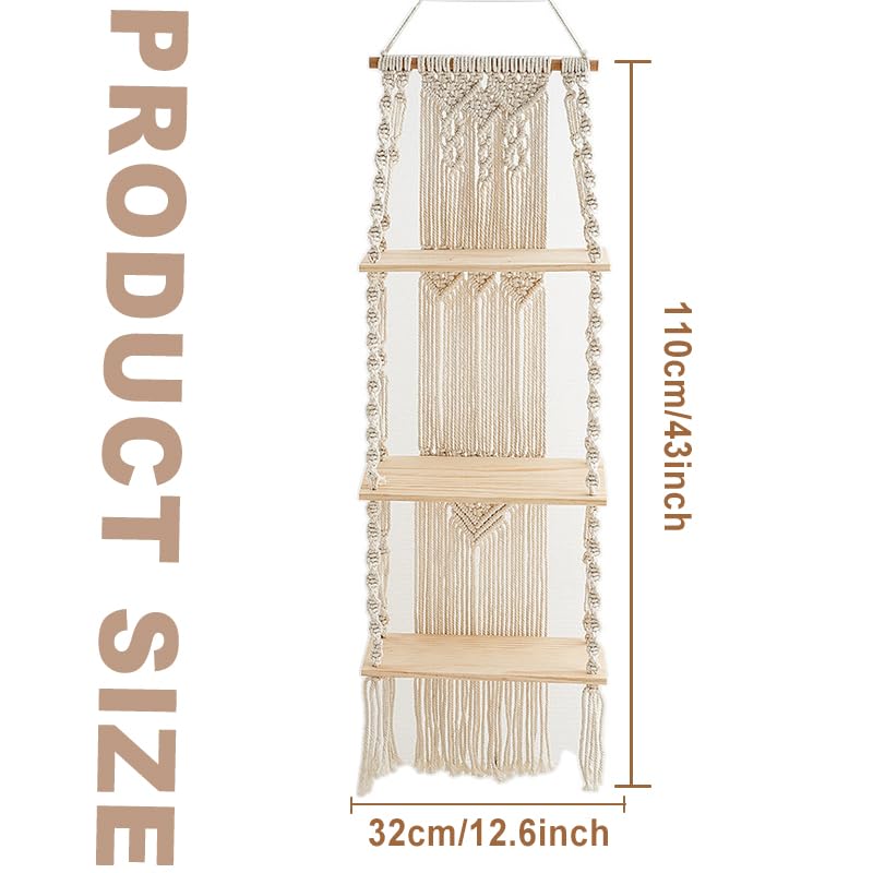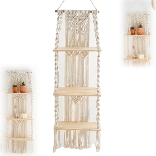 QOOWFEANIG - رف معلق على الحائط من 3 طبقات من المكرمية بوهو مصنوع يدويا من الخشب بنمط بوهيمي من كوفيانيج، ارفف عائمة مزخرفة انيقة لديكور المنزل وغرفة المعيشة وغرفة النوم والشرفة