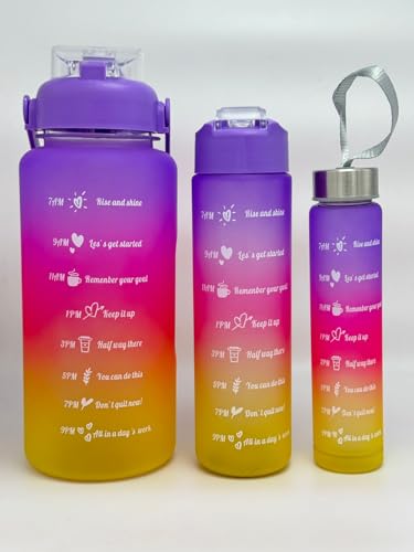 Qshop - مجموعة زجاجات مياه تحفيزية 3 في 1 بشفاطة غير قابلة للكسر ومانعة للتسرب من كيو شوب®، 2000 - 900 - 300 مل، لون متدرج، خالية من مادة بيسفينول أ وغير سامة للمكتب وصالة الألعاب الرياضية والمدرسة (أرجواني)
