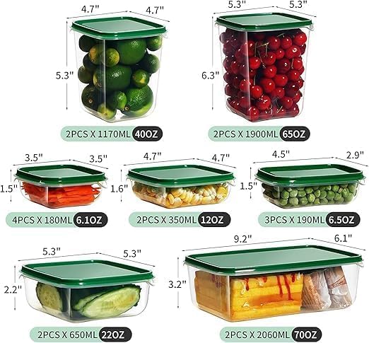 - 👩🏻🍳 17 حاوية بـ 7 أحجام مختلفة. * انظر المحتويات دون إزالة الغطاء. * قابلة للتكديس لتوفير المساحة. * 4 حاويات طعام (3½×3½×1½ انش، 5 اونصة)، 3 حاويات طعام (4¾×3×1½ انش، 5 اونصة)، 2 حاوية طعام (4¾×4¾×1½ انش، 10 اونصة)، 2 حاوية طعام (4¾×4¾×6 انش، 33 اونصة)، 2 حاوية طعام (5½ x5½x5½x2انش، 20 اونصة)، 2 حاوية طعام (5½×5½×6 انش، 54 اونصة)، 2 حاوية طعام (9×6×3 انش، 60 اونصة).