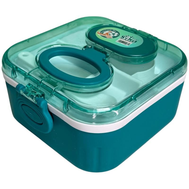 Qshop - لانش بوكس كيوشوب®️ عملي بتقسيمات متعددة – 3 خانات علوية لتنظيم الطعام، مساحة كبيرة سفلية مربعة، 2×1 (معلقة + شوكة) مدمجة، مثالي للشغل والمدرسة والنادي (Turquoise)