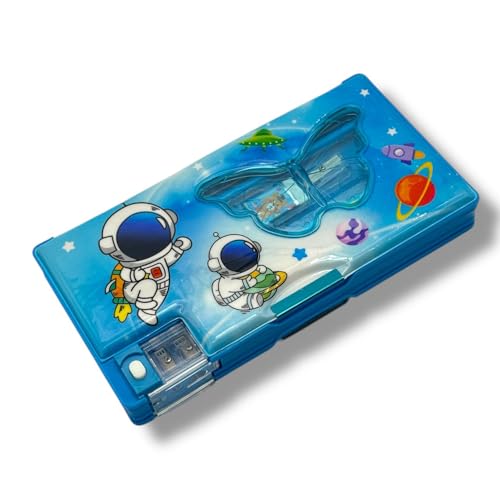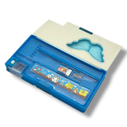 Qshop - مقلمة مدرسية للأطفال من كيوشوب – تصميمات كرتونية رائعة – تحتوي على أدوات مدرسية: مسطرة، قلم، ممحاة، مبراة عدد 2 – مقلمة هدايا مميزة للبنات والأولاد للمدرسة أو الاستخدام اليومي (Blue)
