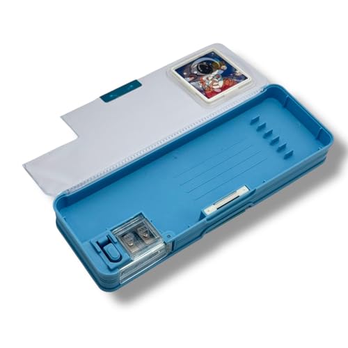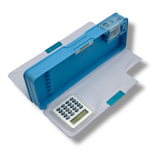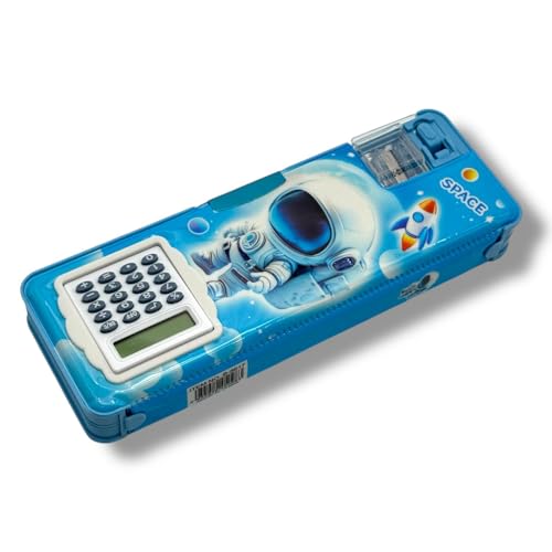 Qshop - مقلمة من كيوشوب®️ مدرسية مزودة بآلة حاسبة ومبراة – مقلمة متعددة الوظائف للبنات والأولاد – خفيفة، متينة، وأنيقة للدراسة والمدرسة (Blue-Space)