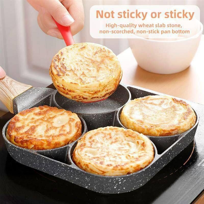 • ١) تصميم عملي: مقلاة بأربع تجاويف دائرية مثالية لطهي البيض والفطائر الصغيرة بشكل متساوٍ