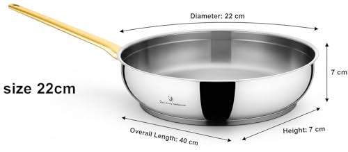 - طاسة قلي من الفولاذ المقاوم للصدأ مقاس 22 سم بلمسة نهائية ذهبية توفر المتانة والتسخين المتساوي، مثالية للطهي متعدد الاستخدامات في المطابخ الأنيقة.