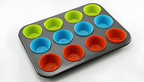 Generic - مجموعة خبز الكعك سريعة التنظيف - استمتع بالخبز باستخدام صينية الكعك المصنوعة من الفولاذ الكربوني و12 قالب سيليكون قابل لإعادة الاستخدام، آمنة للاستخدام في غسالة الأطباق من أجل صيانة خالية من المتاعب و