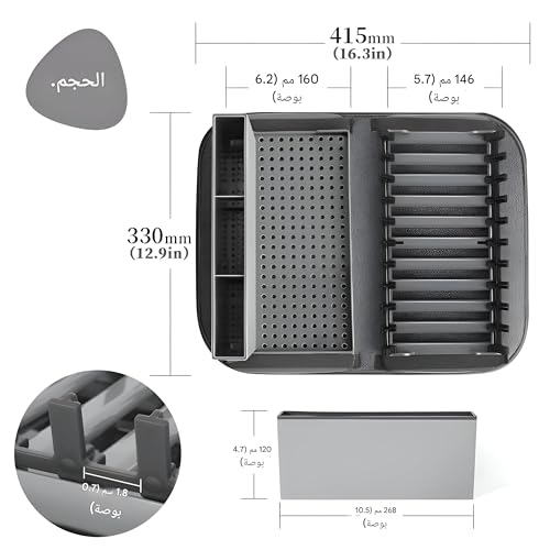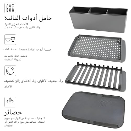 - يوجه نظام الصرف المبتكر الماء من الأطباق مباشرة إلى بساط من المايكروفايبر عالي الامتصاص، مما يمنع الماء الراكد ويحافظ على أسطح الطاولات جافة ونظيفة - لا مزيد من البرك الفوضوية أو الأسطح الرطبة التي يمكن مسحها بعد كل استخدام.